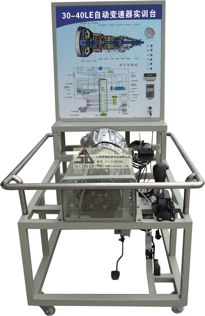 本變速器實(shí)訓(xùn)臺(tái)是本公司采用豐田后驅(qū)A340E自動(dòng)變速器為適應(yīng)汽車教學(xué)需求而研制的,該實(shí)訓(xùn)臺(tái)由電控變速器(八成新)、操作顯示面板及發(fā)動(dòng)機(jī)彩色電氣原理圖電腦控制柜、可移動(dòng)式臺(tái)架(萬(wàn)向腳輪)、驅(qū)動(dòng)系統(tǒng)(腳踏式油門踏板)變頻電機(jī)驅(qū)動(dòng)、啟動(dòng)系統(tǒng)(電門鎖方式啟動(dòng))、車速傳感器、電磁閥執(zhí)行器、原車電腦、具有發(fā)動(dòng)機(jī)運(yùn)轉(zhuǎn)及顯示(轉(zhuǎn)速.車速.檔位)、液壓油壓力顯示表(顯示換檔過(guò)程油壓)、自動(dòng)變速器電磁閥工作指示LED燈、故障設(shè)置區(qū)可設(shè)置12路故障(老師設(shè)置任一路線路故障)、故障排除區(qū)(學(xué)生通過(guò)各種儀器、儀表、)在面板上用專用排故線連接排除故障、傳感器信號(hào)模擬等多項(xiàng)功能、具結(jié)構(gòu)緊湊、操作方便、安全可靠、教學(xué)直觀、是汽車自動(dòng)變速器實(shí)物教學(xué)不可缺少的實(shí)驗(yàn)室設(shè)備之一。