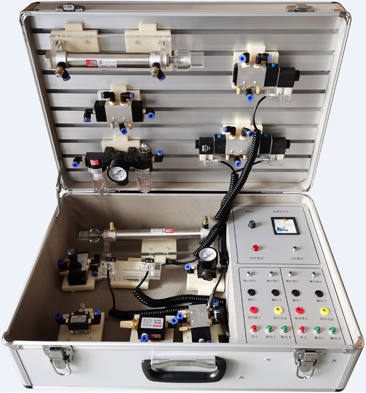 便攜式氣動傳動基礎(chǔ)實訓箱, 氣動實驗箱是根據(jù)《液壓與氣壓傳動》、《氣動控制技術(shù)》等,是我公司根據(jù)各大專院校機電一體化對氣、電、液控制的教學大綱要求,氣動與繼電器控制實訓設(shè)備的優(yōu)點,采用了開放型綜合實訓箱結(jié)構(gòu),使氣動原理與自動控制理論得到有效的運用,廣泛征求專家教授與老師的意見,經(jīng)不斷創(chuàng)新改進研制而成。