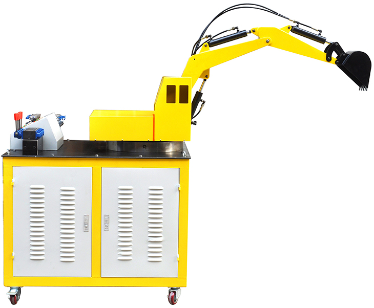 工業型挖掘機液壓實訓臺能模擬真實挖掘機工作裝置和回轉機構的各種動作,最高工作壓力可達7MPa,實訓臺由液壓挖掘機工作裝置、回轉機構、液壓傳動系統、電器控制器件、可編程控制器(PLC)和實訓桌組成,可實現挖掘、提升、回轉、卸料等典型動作。其中,液壓傳動系統配備手動、PLC控制兩種方式,分別由四組手動換向閥和電磁換向閥實現。通過操控本實訓臺,學生可以清晰地了解單斗液壓挖掘機的液壓元件組成、液壓回路工作原理、典型動作控制方式和機械結構。