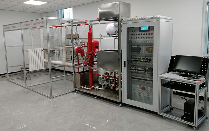 2、消防給水系統(tǒng):主要有給水箱、噴淋泵、穩(wěn)壓罐、濕式報警閥、壓力開關(guān)、水流指示器、消防給水管道、閉式噴淋頭等組成。管路采用鍍鋅管進行設(shè)計,可進行鍍鋅管的切割、套絲、安裝和通水試驗操作,通過控制系統(tǒng)可實現(xiàn)噴淋滅火功能。