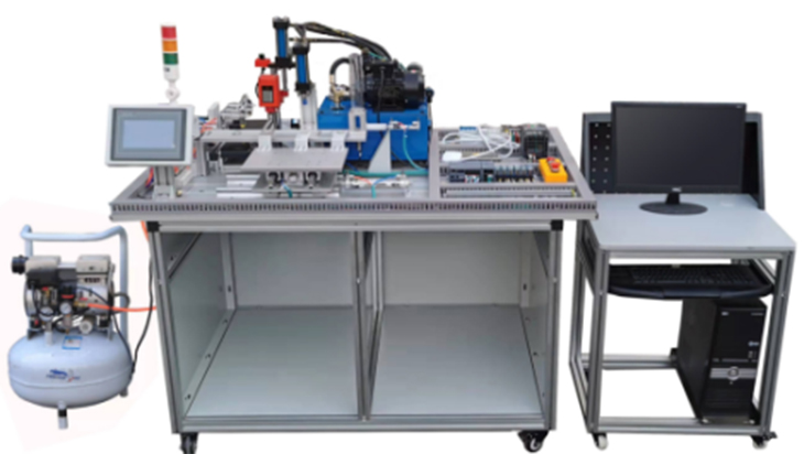 機電液氣一體化綜合實訓(xùn)考核裝置的實訓(xùn)工作臺為鋁合金型材組合而成,臺面上安裝有上料、傳送、沖壓加工、夾緊、鉆孔加工、分揀、入料槽等,并配有液壓系統(tǒng)、氣壓系統(tǒng)、變頻器及繼電器控制、PLC等